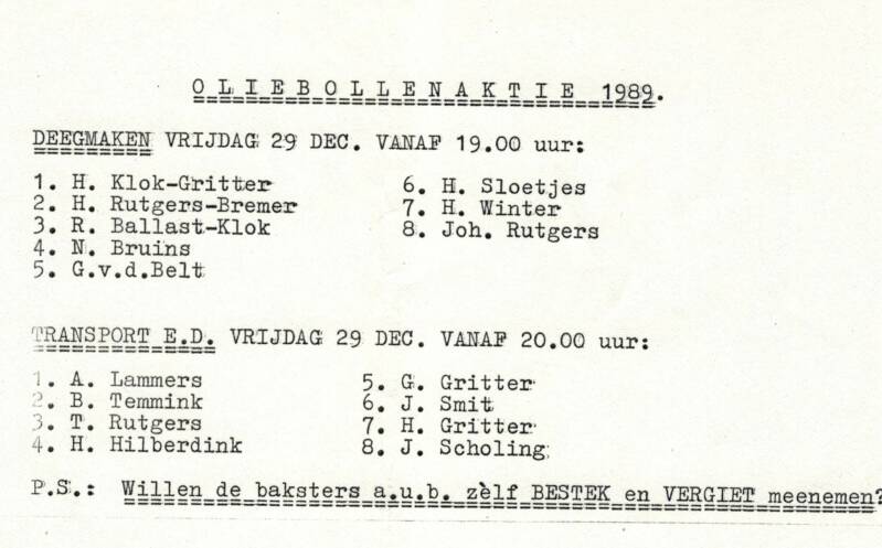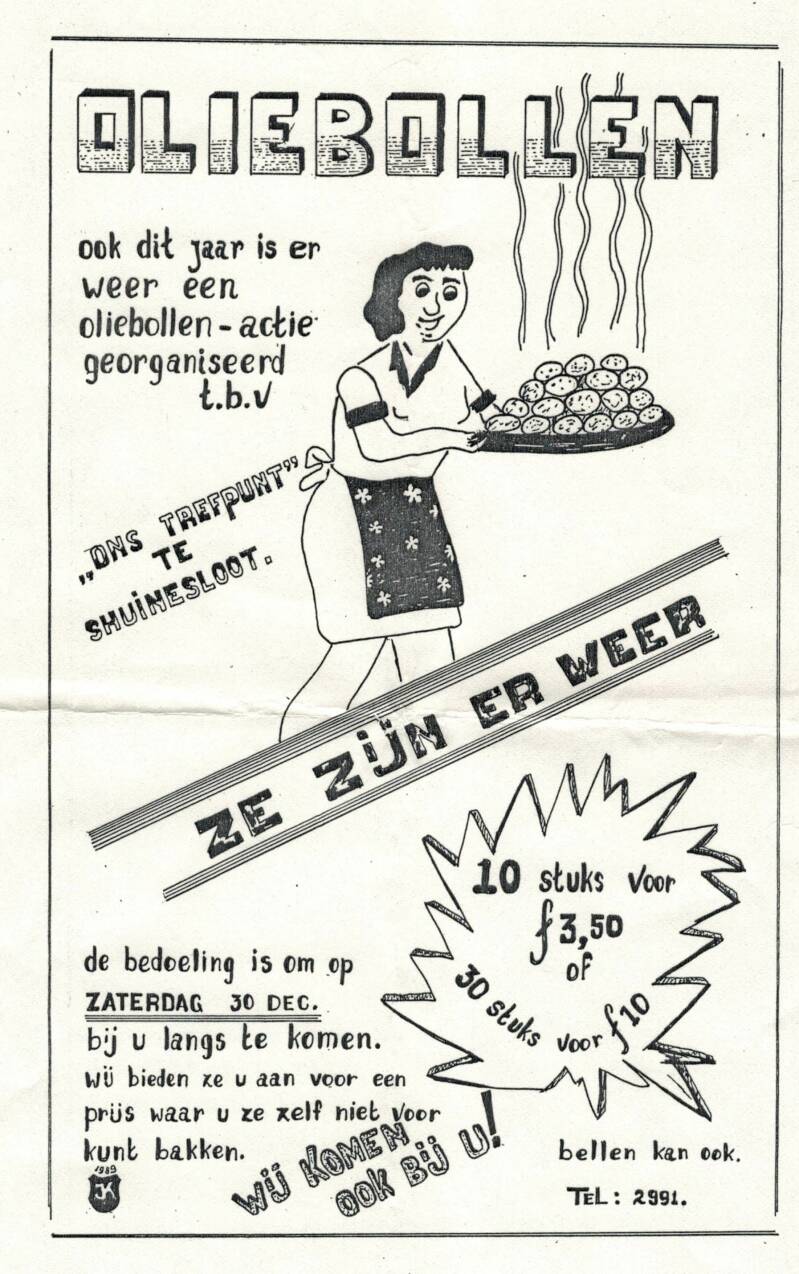 Iedereen had een taak, dag en nacht werd er doorgebakken, het systeem werkte en werd in goede banen geleid. En wat was het gezellig, de jeugd van de clubs gingen langs de deuren om te venten. Zo zorgde jong en oud er samen voor dat we `Ons Trefpunt` in stand konden houden.