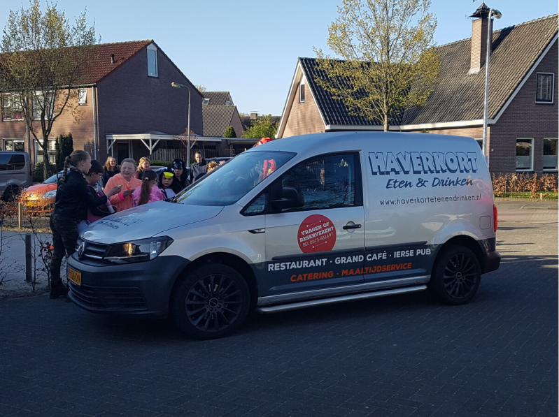 Terwijl in alle vroegte de juffen, meesters en de dames van de activiteitencommissie met de laatste voorbereidingen bezig zijn. Komt `Haverkort eten & drinken` het lekkere verrassingsontbijtje brengen, die de kinderen straks aan Meester mogen aanbieden.