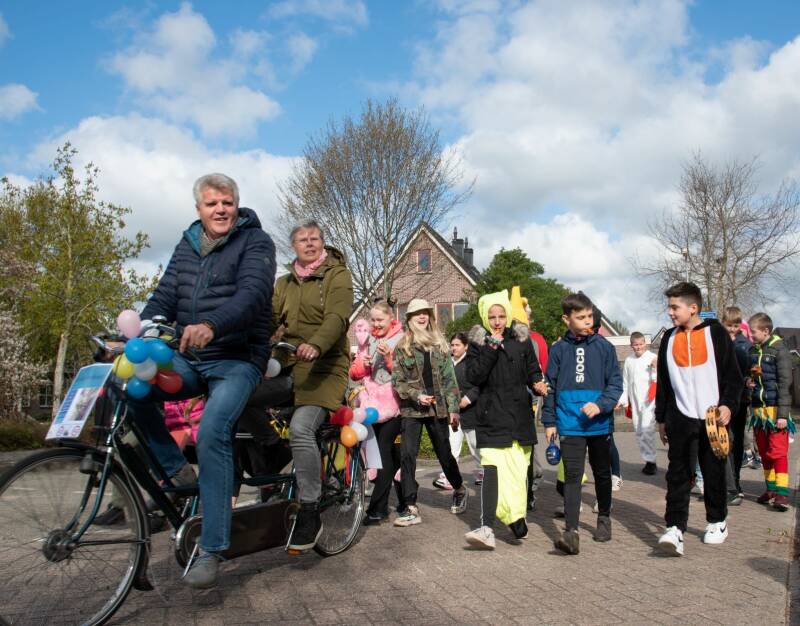 Na het ontbijt is het tijd dat heel Schuinesloot weten mag dat het feest is vandaag! Meester mag voorop op de tandem en achter hem aan loopt een optocht van kinderen.